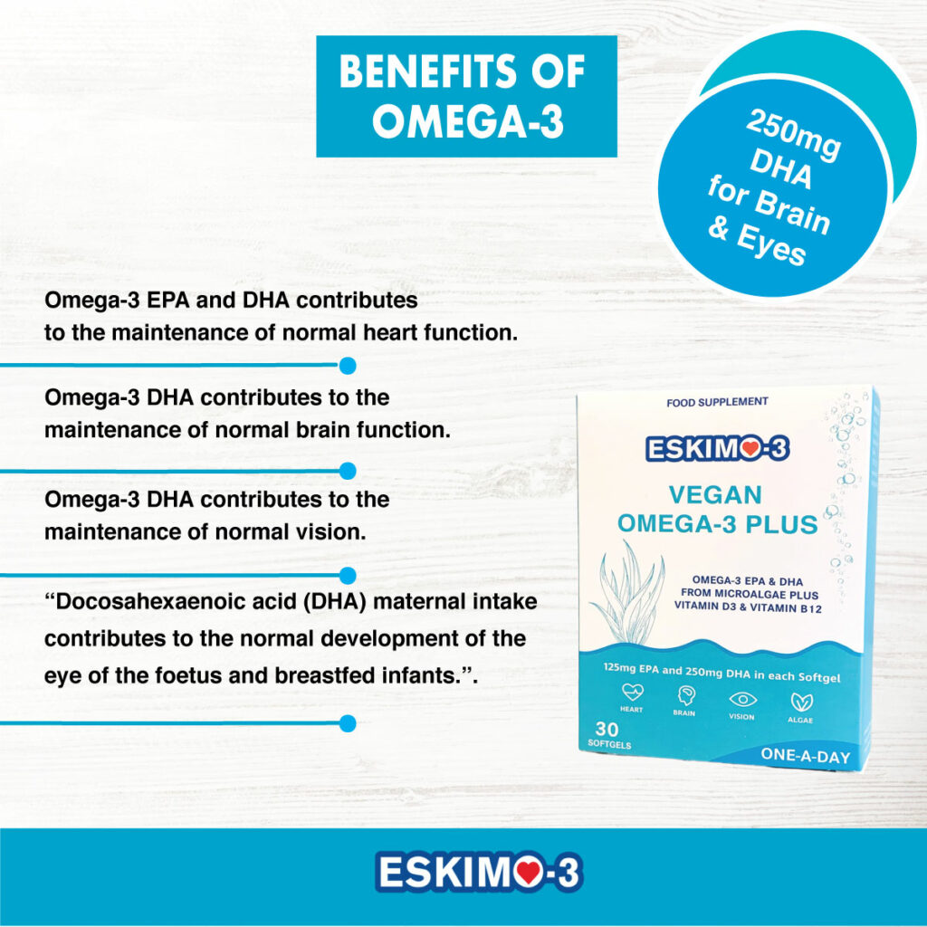 - Pregnancy: Omega-3 DHA maternal intake contributes to the normal brain and eye development of the foetus and breastfed infants.