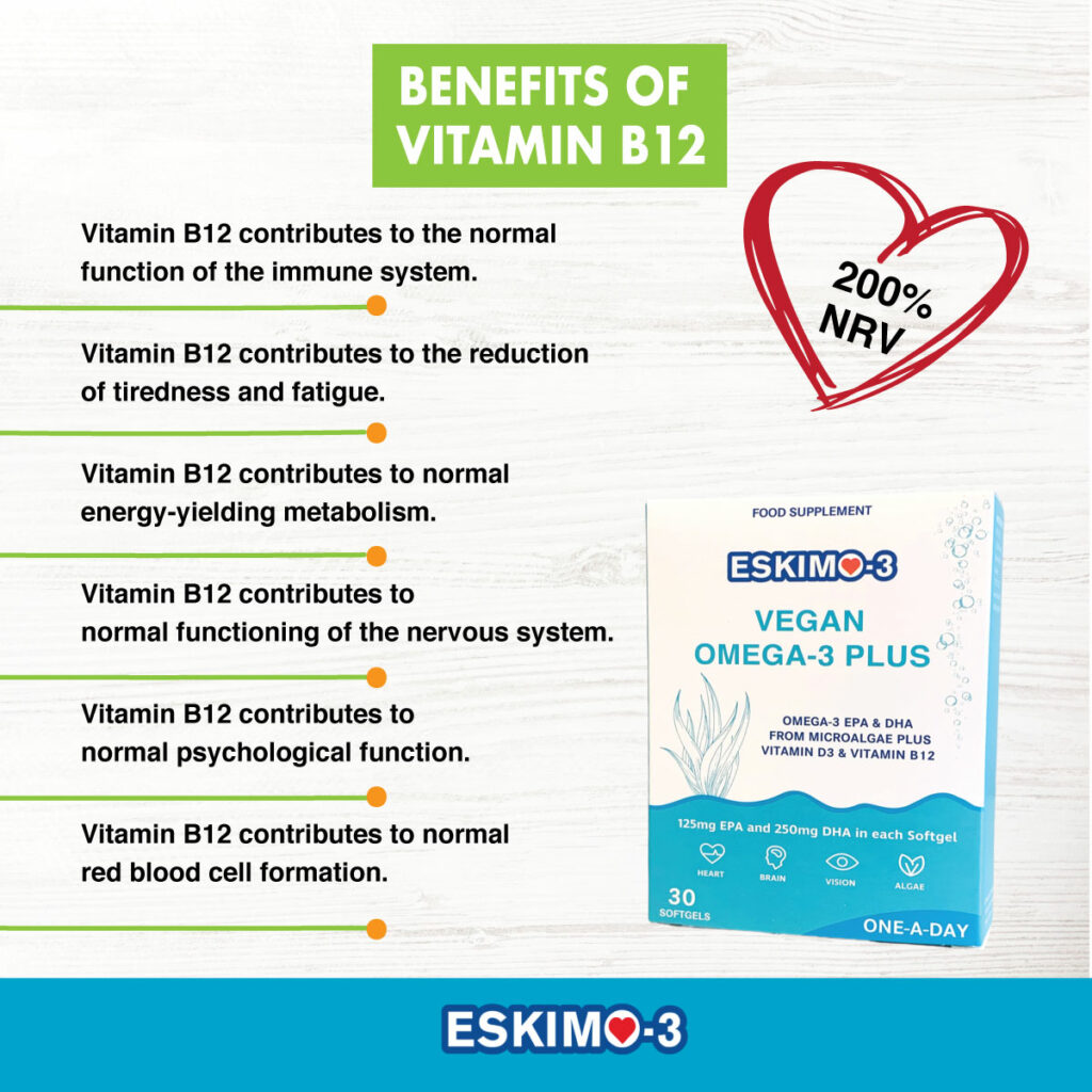 - Vitamin B12 for energy, reduction of tiredness, the immune system and nervous system.