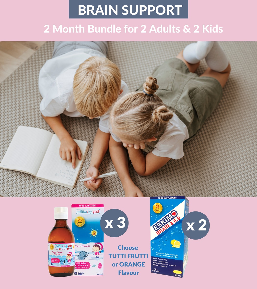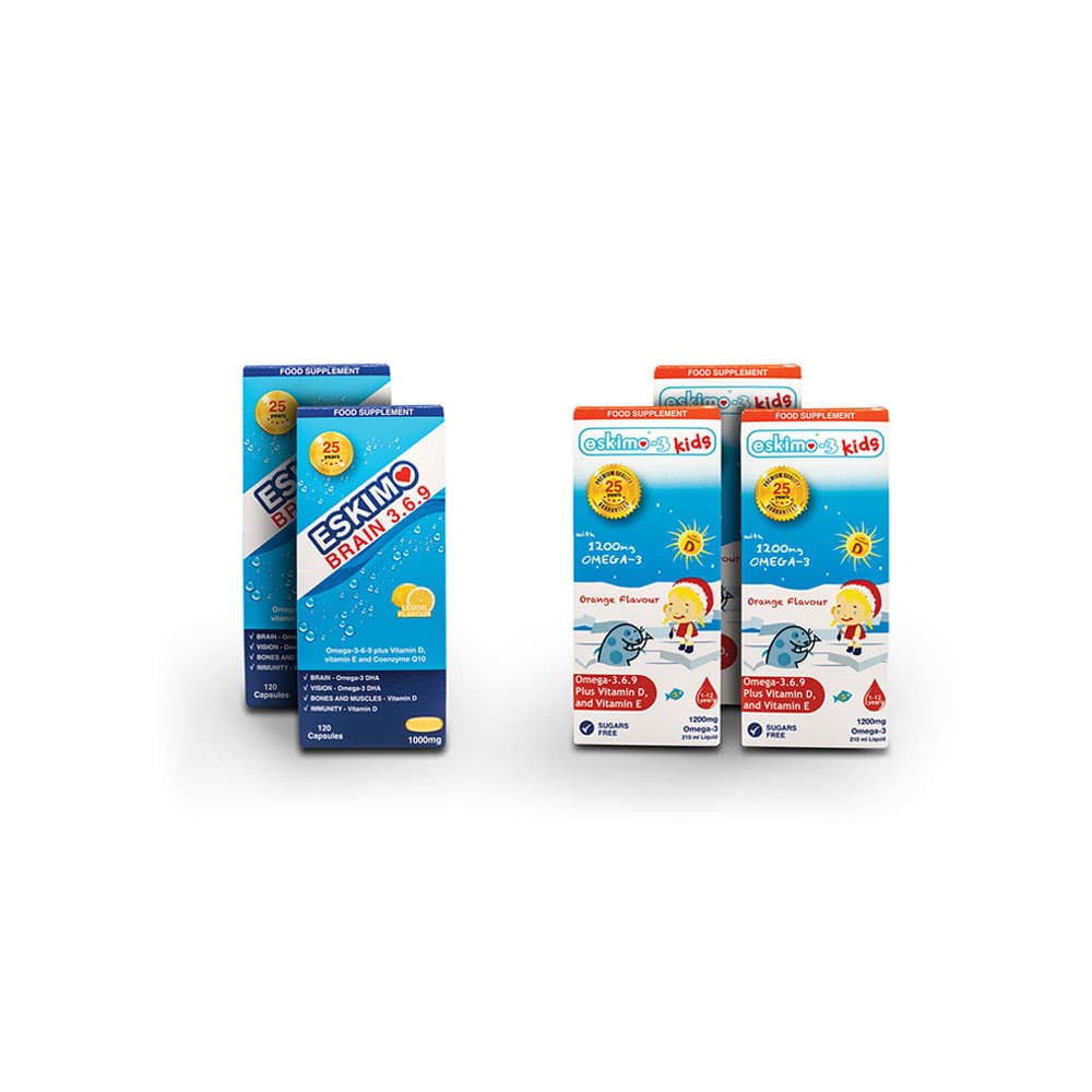 Contains 2 x Eskimo Brain 369 Capsules, and, 3 x Eskimo-3 Kids Liquid 210ml Orange or Tutti Frutti flavour.