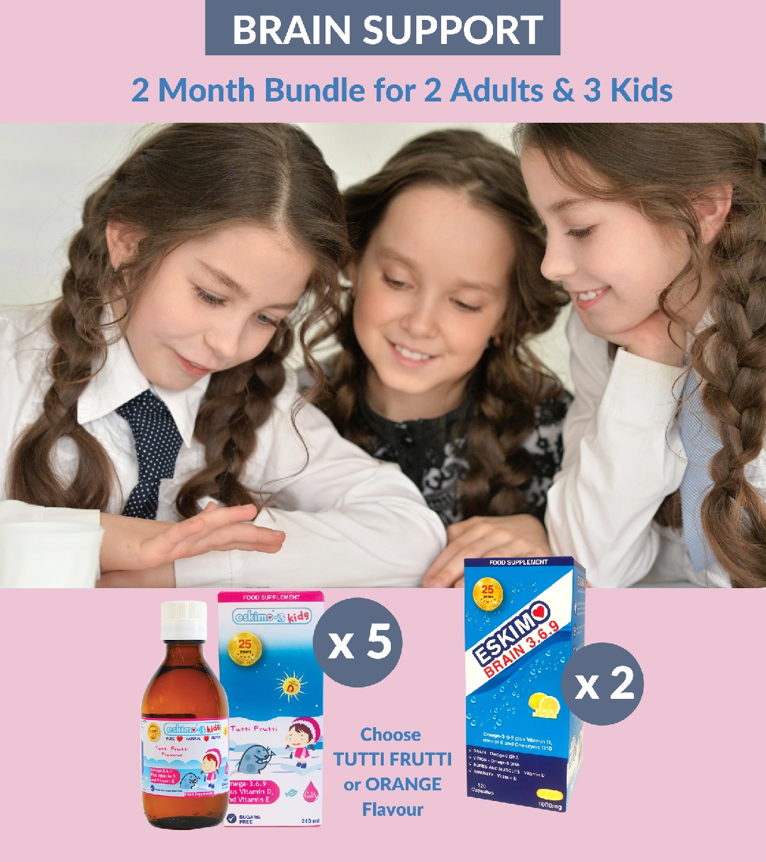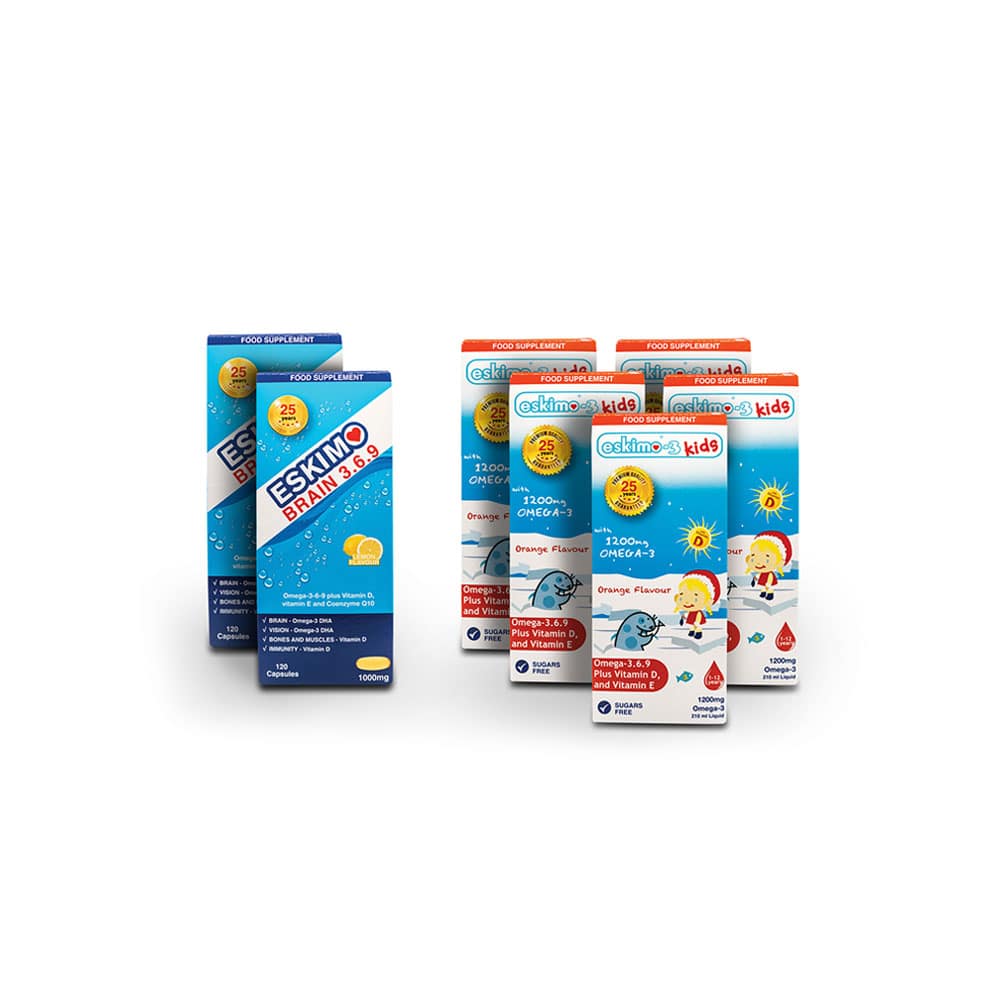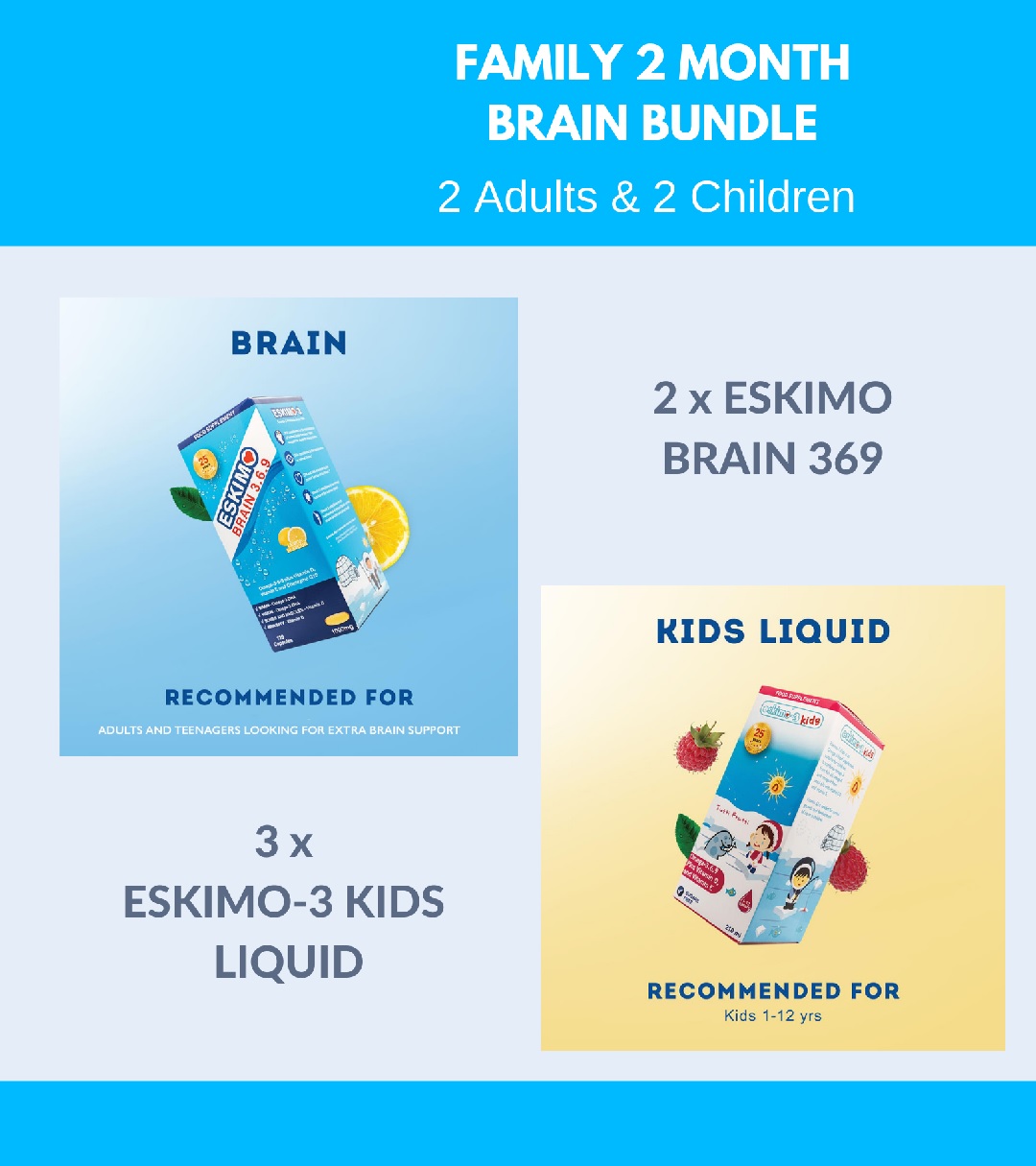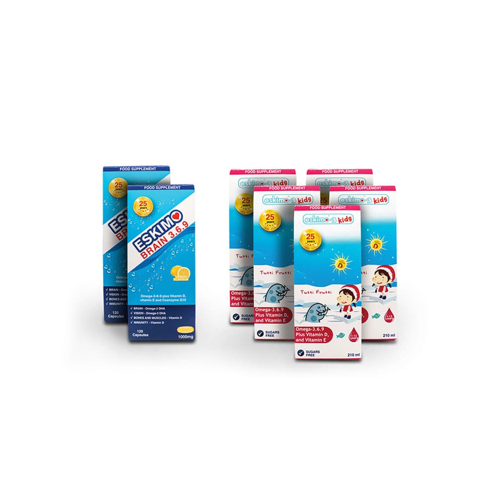 Contains 2 x Eskimo Brain 369 Capsules, and, 5 x Eskimo-3 Kids Liquid 210ml Orange or Tutti Frutti flavour.