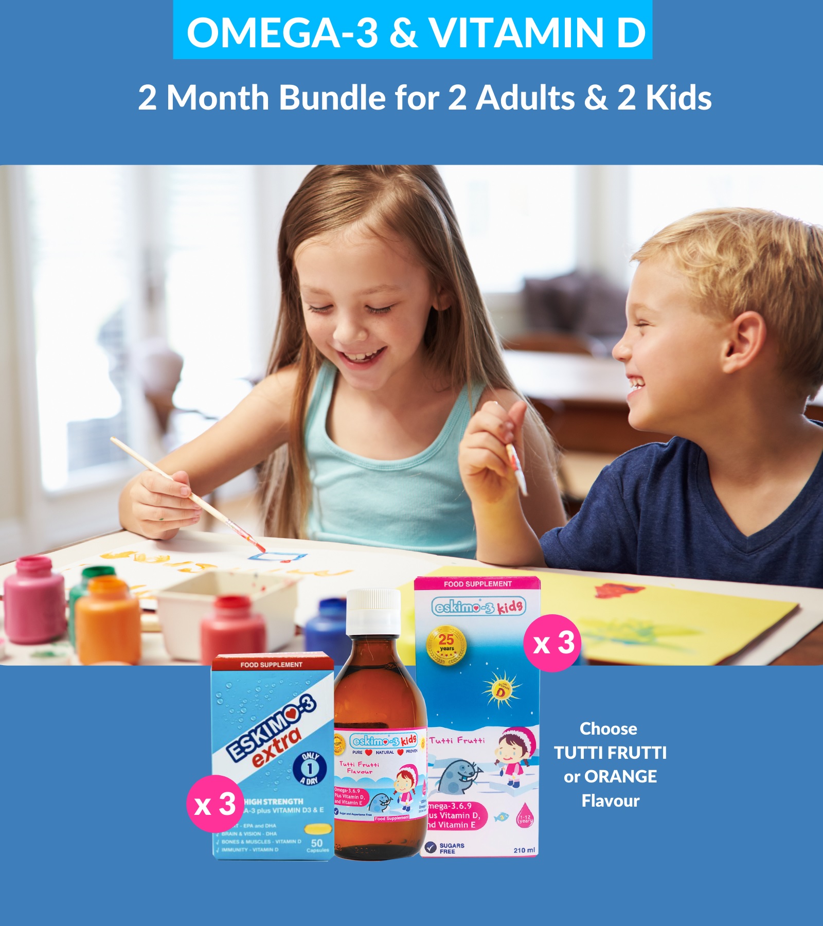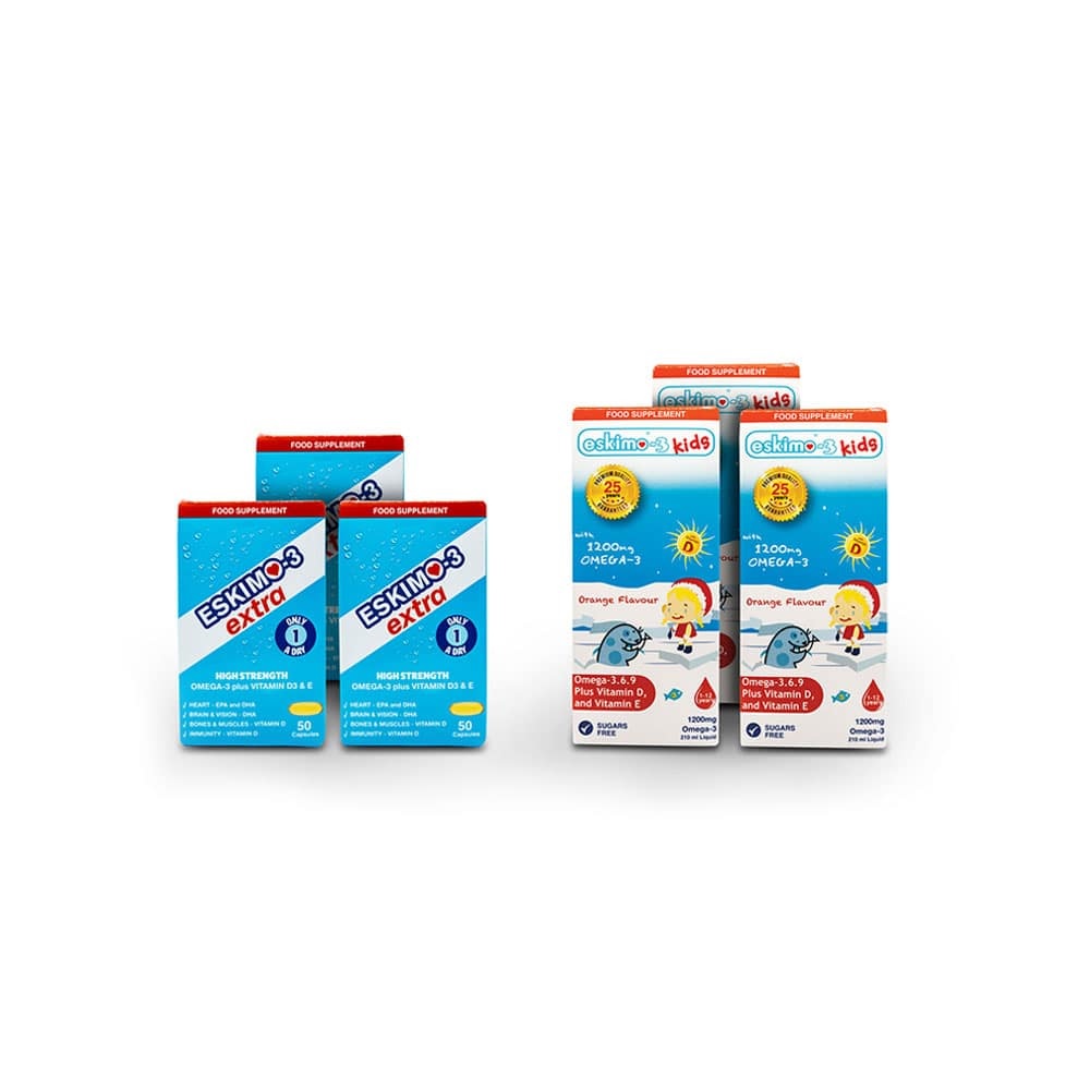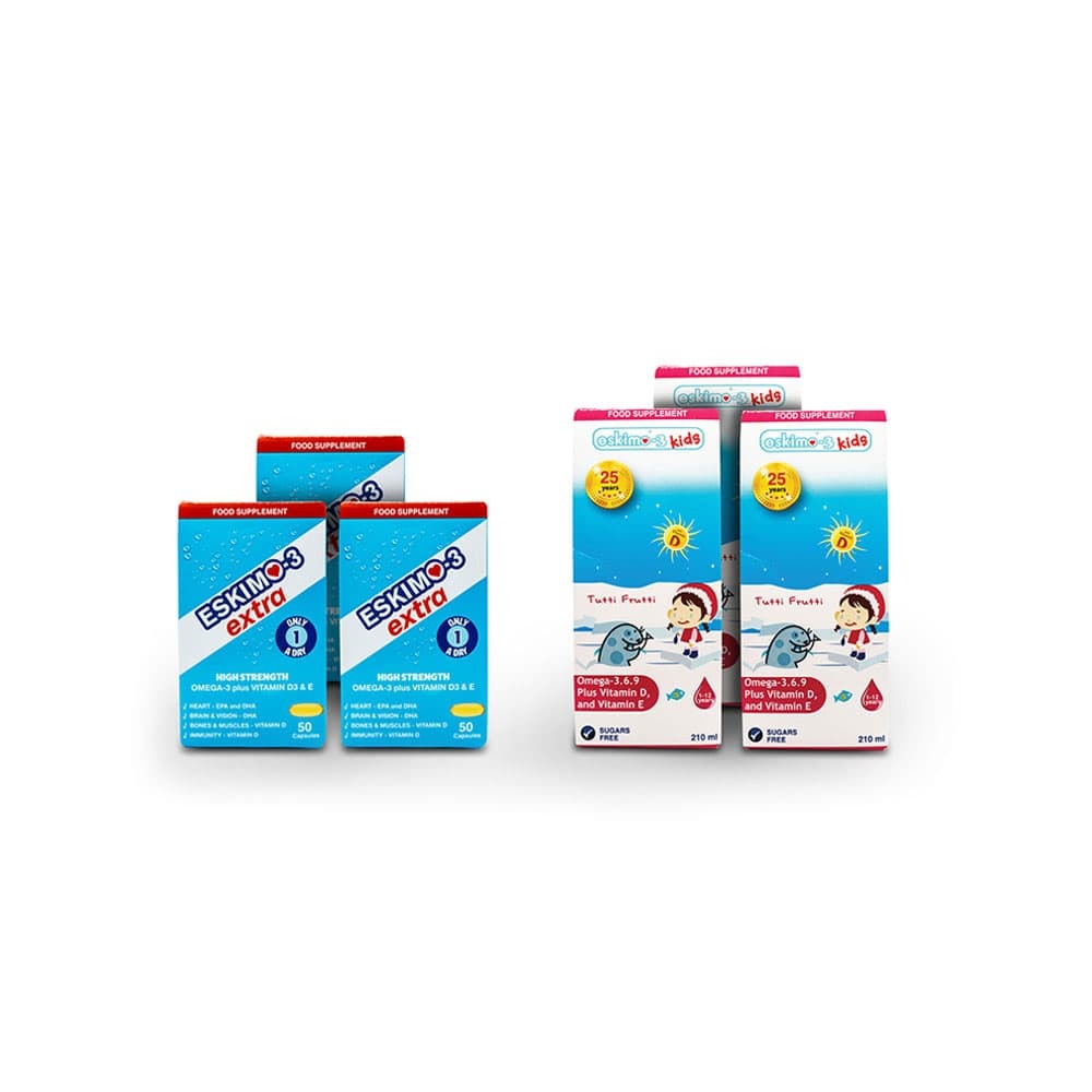 Contains 3 x Eskimo-3 Extra with Vitamin D3, and, 3 x Eskimo-3 Kids Liquid 210ml Orange or Tutti Frutti flavour.