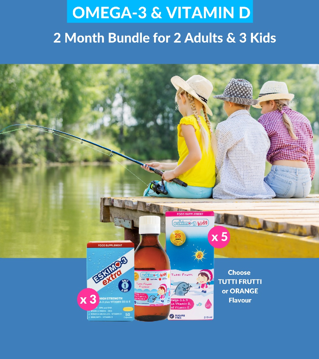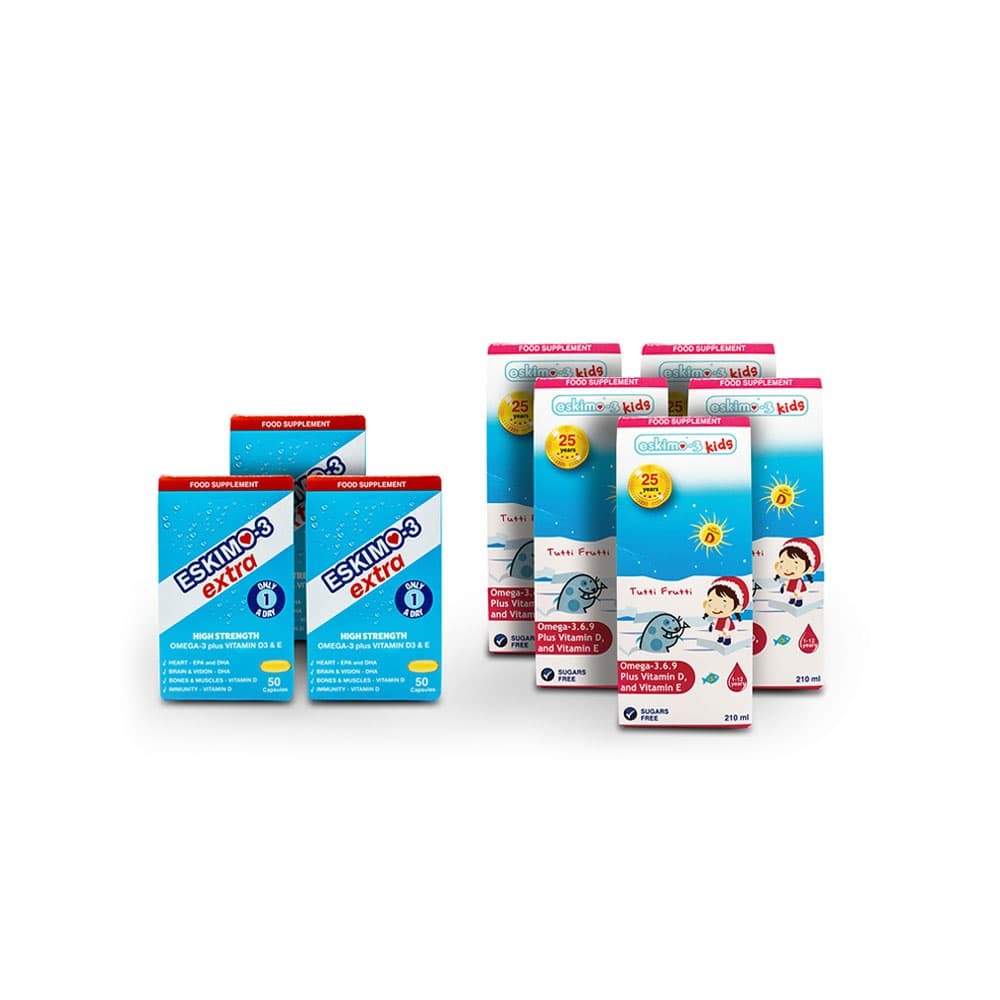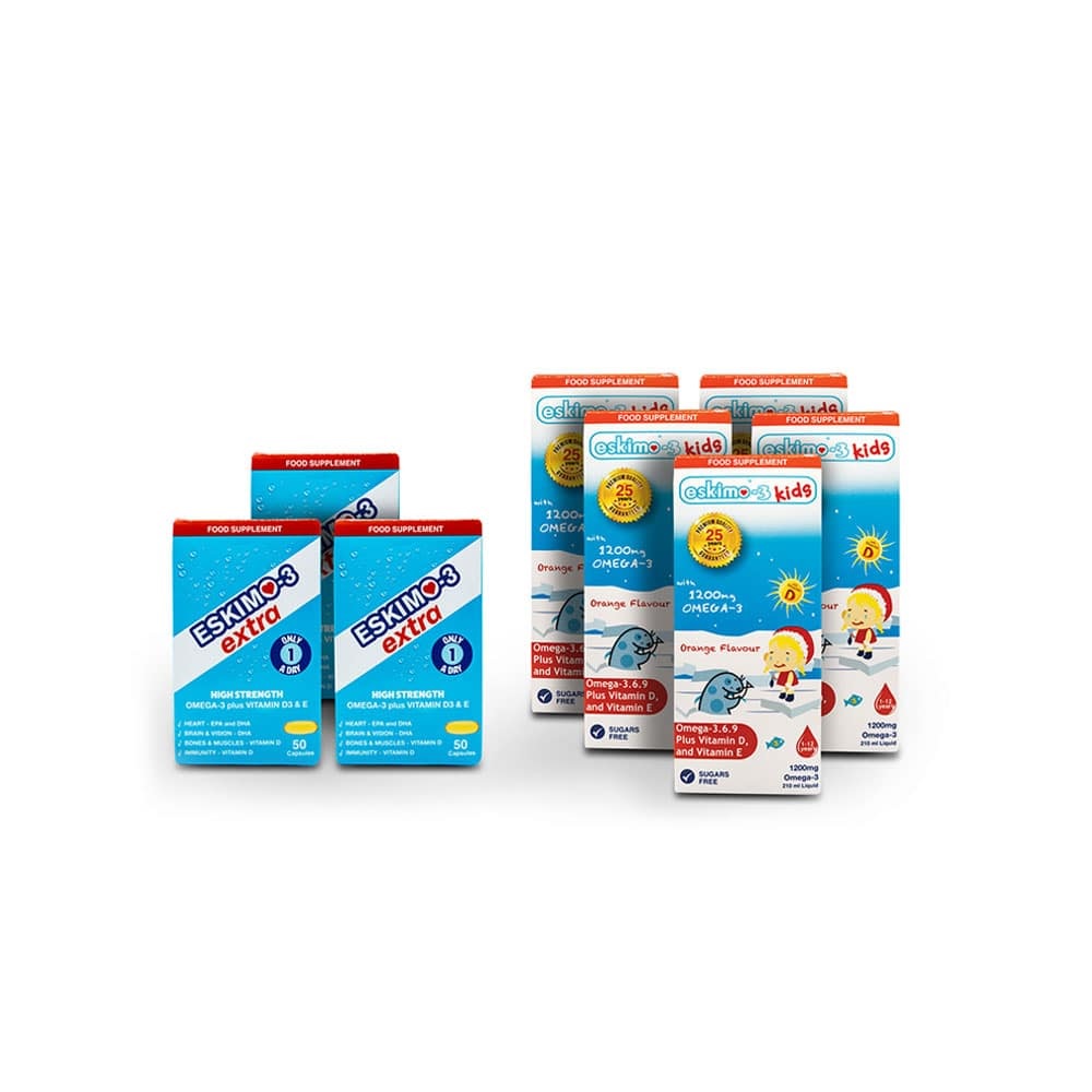 Contains 3 x Eskimo-3 Extra with Vitamin D3, and, 5 x Eskimo-3 Kids Liquid 210ml Orange or Tutti Frutti flavour.
